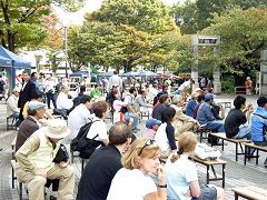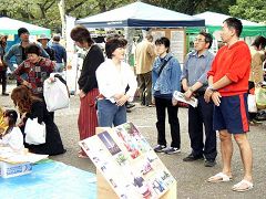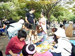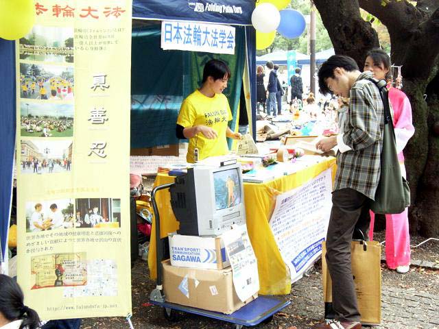 在法轮大法学会的展位,学员展出了各种语言版本的法轮功著作、《·九·评*共产党》、新!唐!人:新年晚会DVD和舞台摄影集等丰富的出版物。并现场播放法轮功教功录像,展出世界各地学员的炼功照片。有缘人相继而来,先后有日本人购买了《法轮功》,西方人购买了英文《转法轮》。有识的市民购买了揭露中共邪恶本质的《·九·评*共产党》,艺术爱好者购买了新!唐!人:新年晚会DVD.一群来自中国的年轻的学生,听学员讲述法轮功的真相,并全部看完了“正法之路”图片展。在祥和的能量场之中,能感受到年轻的生命的震撼,临走,他们拿走了中文的·九·评*和光碟。