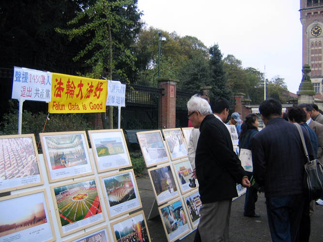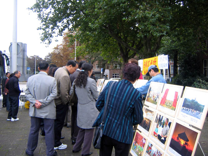 那边走来两位从大陆来的留学生,看到两位荷兰学员在那儿炼功,她们惊奇的说:“看哪,那是法轮功,外国人都炼这法轮功。”说完,拿起相机就照,“这可是世界和平宫的一美景”,其中一个自言自语道。
