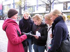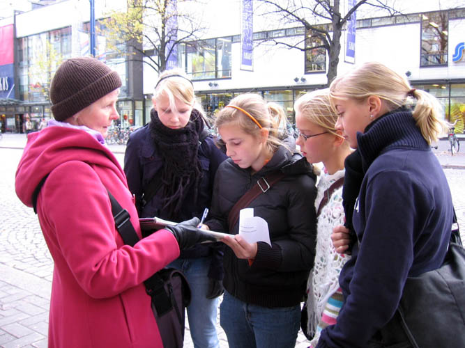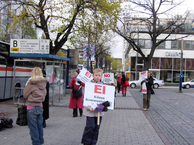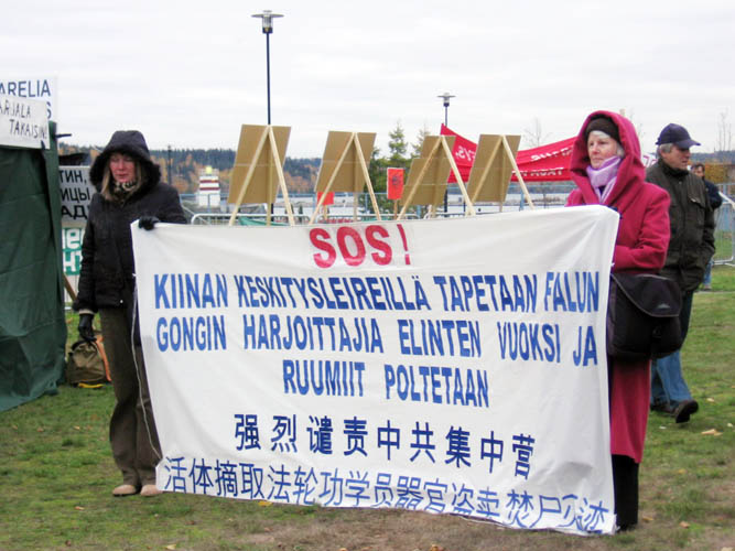 上午学员们顶着冷风,手举中、芬、俄、英语的声援退出中共的标牌,手拿揭露中共活摘法轮功学员器官罪行的传单,在市中心、露天市场和步行街向人们散发并征集反迫害签名。