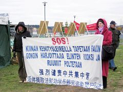 下午学员们到西贝柳斯大厦向人们展示真相横幅,发真相传单,几位示威者也过来帮学员挂横幅。横幅展示的是受迫害法轮功学员的照片及“强烈谴责中共集中营活体摘取法轮功学员器官盗卖焚尸灭迹”。在场的人几乎人人都接了传单。很多人签名声援法轮功,呼吁迫害能尽早被制止。