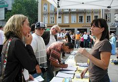 经过全球范围内法轮功学员们不懈的讲真相努力,如今,人们越来越渴望了解法轮功。当学员刚刚从车上往下搬东西时,就有不少德国人和意大利人过来询问。在举办活动的过程中,了解了真相的路人还为法轮功学员送上白玫瑰。