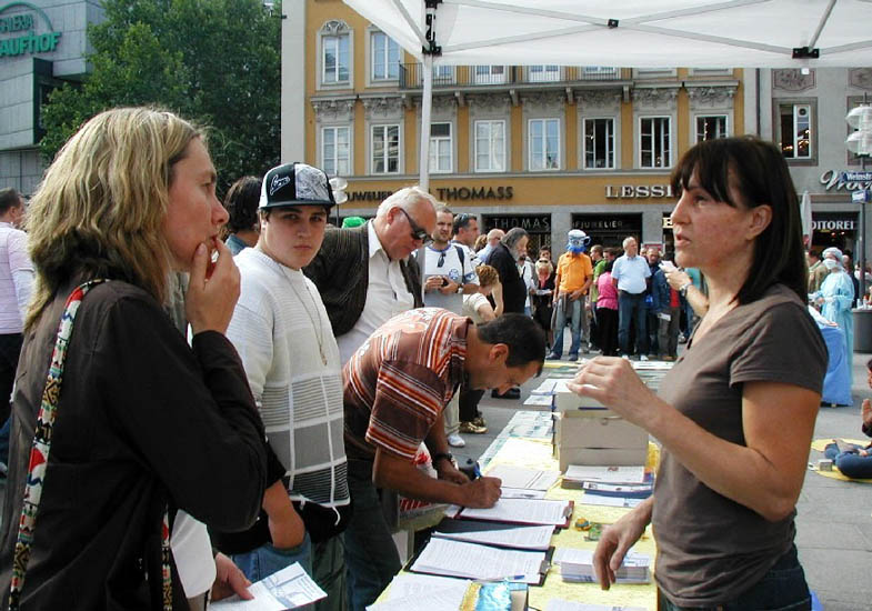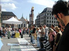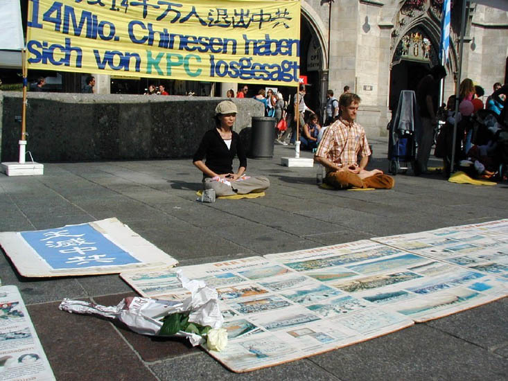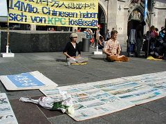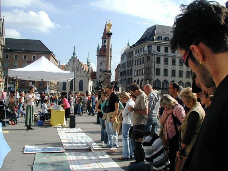 二零零六年九月三十日,德国慕尼黑的法轮功学员在市中心玛琳广场(Marienplatz)举办了声援一千四百万人退出中共的活动。 这个周末慕尼黑啤酒节进入尾声,秋高气爽,引来无数德国和世界各地的游客。人们被法轮功学员祥和的炼功场景所吸引、被中共的暴政所震惊,尤其是当人们看到揭露中共活体摘取法轮功学员器官的真人模拟表演后,纷纷接过学员递上的介绍法轮功无辜遭迫害、发生在中国的退!党!大潮等资料,不少人签名要求德国政府出面制止中共的非人行径。