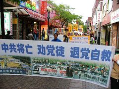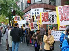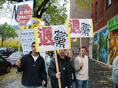 四、五个西方年轻人表示支持退!党!服务中心的行动,举着退!党!的牌子参加游行。他们还询问怎么帮助制止中共活摘法轮功学员器官,并询问法轮功网站的网址,表示他们会打电话向加拿大政府提出要求,出面制止中共的暴行。