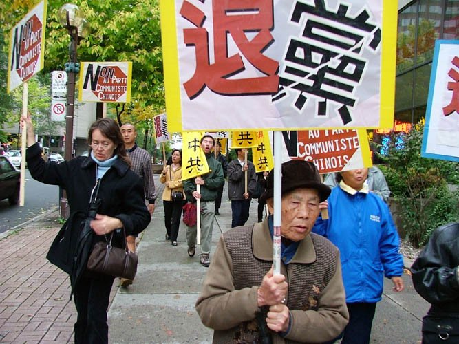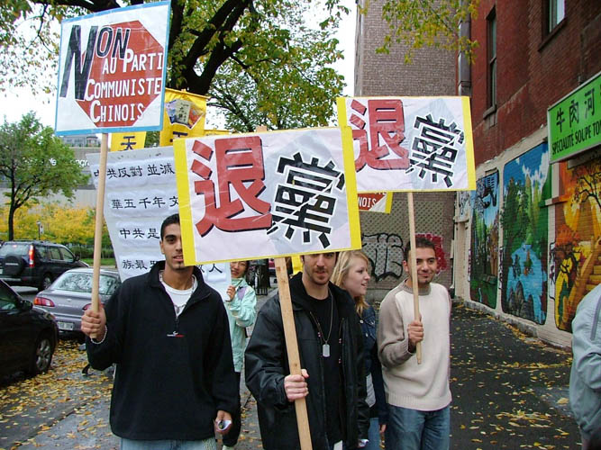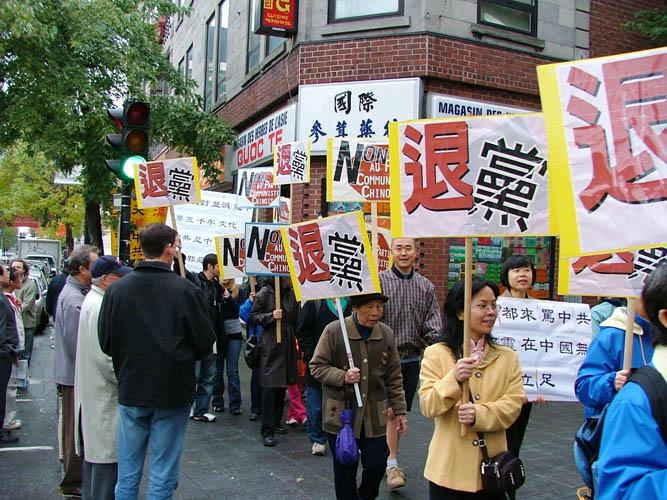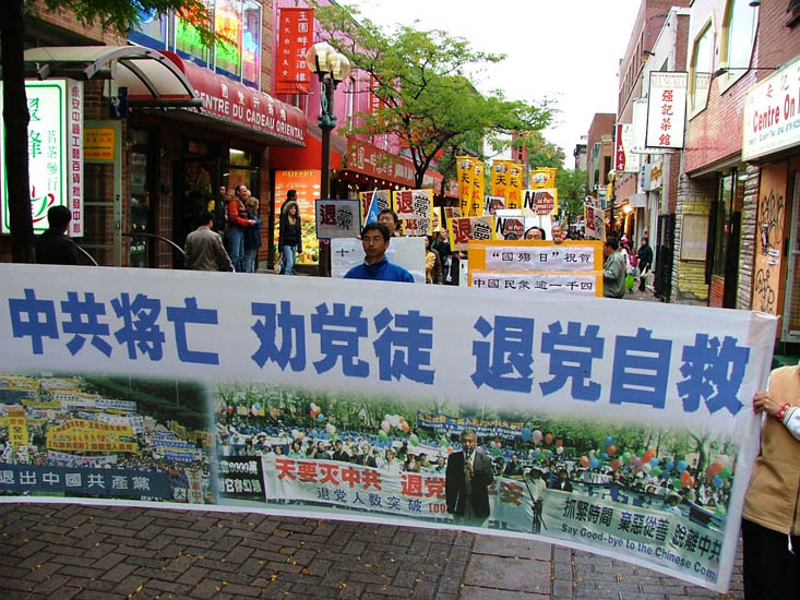 游行队伍环绕蒙特利尔中国城四十多分钟,沿途呼喊口号,向民众传达讯息:“十一:中国国殇日、中共窃国日”、“中共建政五十七年,杀害同胞八千万”、“退!党!自救,退!党!爱国”、“诉苦讨共,退!党!保平安”、“中共不等于中国”。