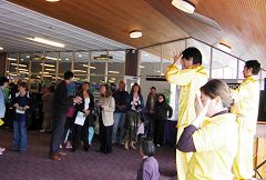 ![]() 法轮功学员的功法表演吸引很多人驻足观看 |