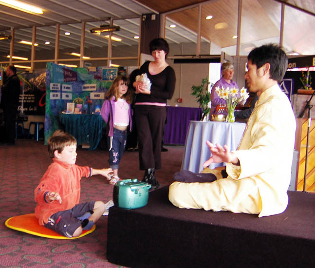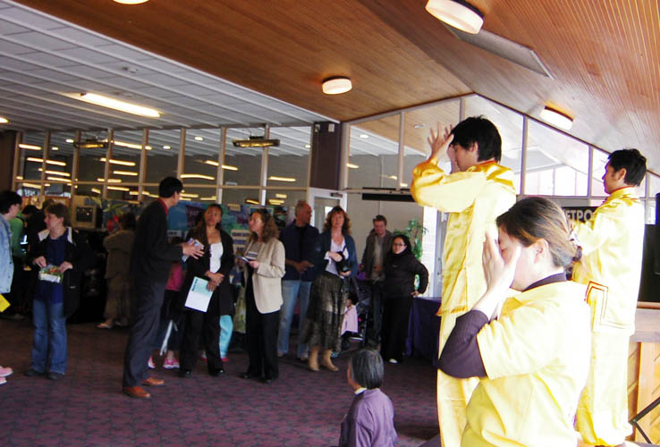 每年的“身、心、灵”节都汇集了各种不同的养身健体的方式方法。法轮功学员的功法表演总是吸引很多人驻足观看。来这里的人,都对心灵与身体健康的关系认识比较深,其中有不少人对能量的感应也比较强。有一位新西兰男士走过来和学员说,“你们这里的能量场很强,我在其它地方没有感受到过这么强的能量场。”也有的人在观看了功法展示后,主动找学员在现场学功。天真无邪的孩童更是心有灵犀,学功总是很认真,并且很多一上来就可以做标准的双盘打坐姿势。