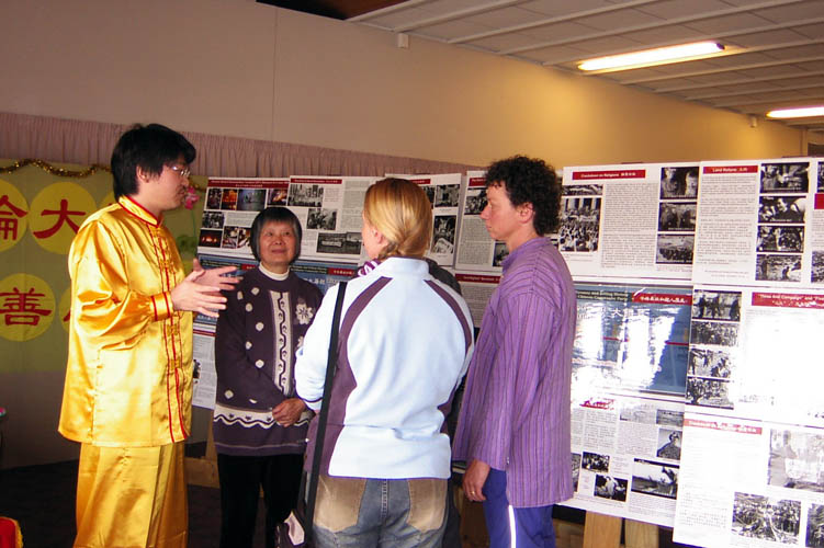 学员们在展示法轮大法的美好的同时,也举办了《·九·评*共产党》的真相图片展。这次活动的主办人Deryn女士为此还特别给学员安排了一个比较大的展位,她说,“我在上次文化节上看到你们的功法表演和展览效果很好。所以,我希望你们在这次活动中也可以这样做。”另外,Deryn女士还坚持只收法轮功学员小展位的费用,尽管给他们的展位几乎是最大的。她说,“你们告诉人们迫害真相很不容易,很辛苦。”