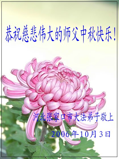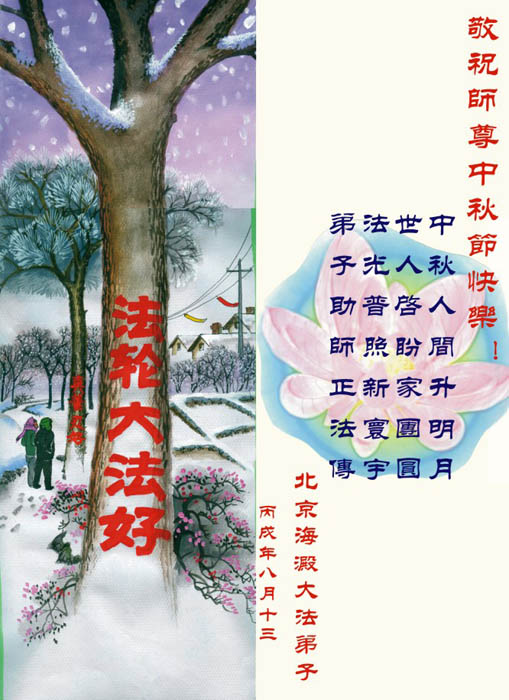 师尊您好:中秋节到了,山西大同全体大法弟子向您问候、您辛苦了!您为众生付出了一切,在此中秋佳节之际,我们全体大法弟子更要勇猛精進,不辜负师父的慈悲苦度,做好大法弟子应该做好的三件事。