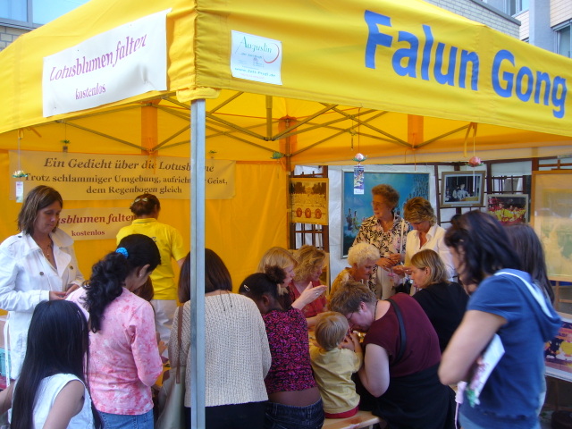 学员们在另一顶帐篷下免费教别人折纸莲花。在那里从早到晚孩子们和成年人络绎不绝,以致我们真希望能再加一张桌子以满足需求。因为我们经常没有足够的人手,有一位妇女就自告奋勇的帮我们教那些初学者,并向他们解释简单的折纸技巧。大法的力量也在这里展现着,这里的每一个人都为别人着想,互相帮助。这里的气氛多么和谐啊,这里也是这次节日里吸引较多人的一个展位。