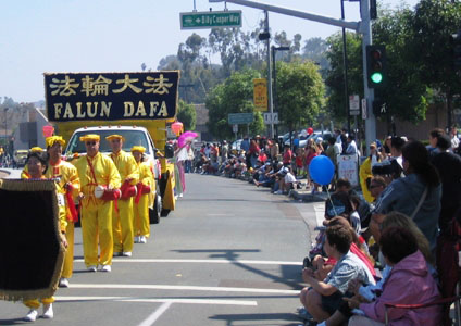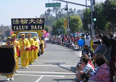 法轮功学员的队伍由横幅、腰鼓队、花车和仙女队组成,将法轮大法的美好及祥和展现给世人。整个游行路程两侧围满了观众,一路上司仪不断的向沿途的观众介绍法轮大法,花车队伍所到之处,不断的赢得阵阵掌声及欢呼声。有的观众脱帽向队伍致敬;有的竖起大拇指叫好;还有几个小孩子合十致意,并高声说:“法轮大法”;有几个中国观众更是被惊呆了,一直目送着法轮大法的队伍。