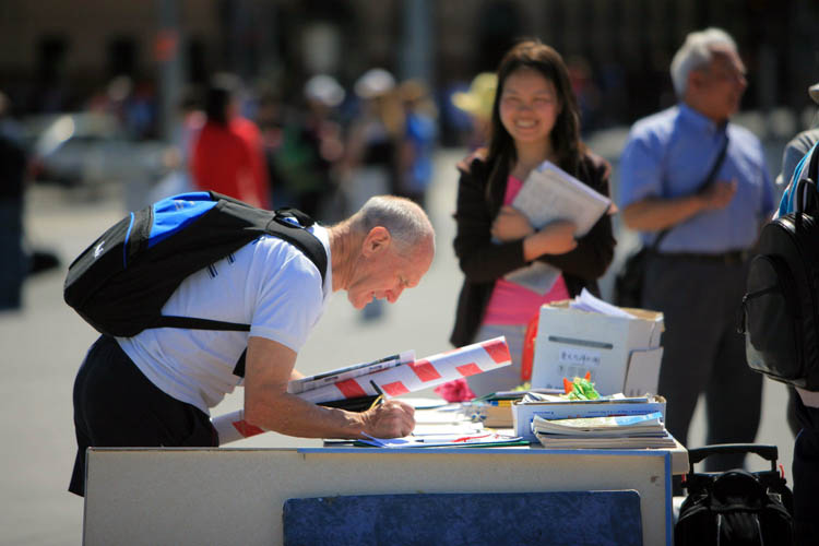 活动中,学员们广发“·九·评*”及活摘器官真相传单,过往行人看到图片上所记载的中共执政后的杀人记录,非常震惊,停下脚步来与学员交谈。一名西人说,自己刚从中国旅游回来,对中国印象还不错,虽然知道中共在过去犯过很多罪恶,但可能也有進步吧。今天了解了活摘器官的真相,才知道中共真的是没救了,在虚伪的繁荣外衣包裹下的都是屠杀、谎言和泯灭人性,中国人太可怜了,一定要救他们。当他问到该如何帮助时,学员递给他一张征签表,他痛快的在上面签了名。