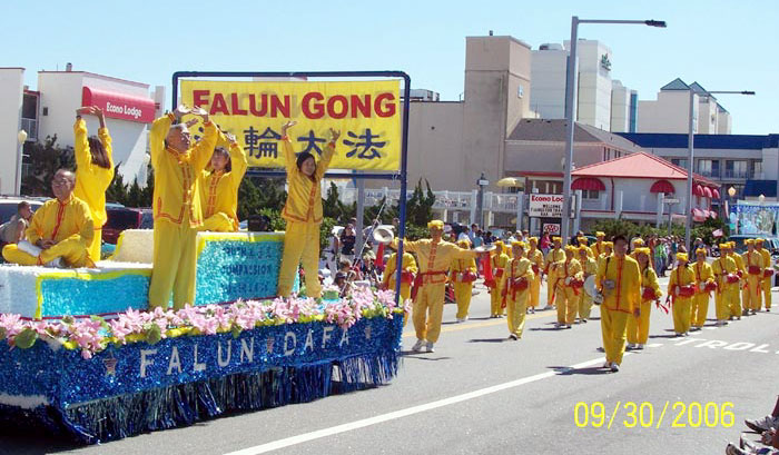 代表中国传统文化的法轮功游行队伍是第四次受邀参加海洋节游行。他们身着金黄色调为主的炼功服装,在阳光下格外醒目。莲花点缀的花车简洁但有特色,当学员在上面表演五套功法时,花车的评委连说“很好很好”。游行前,一个小女孩专门跑到花车的“法轮大法”几个大字下面,要求妈妈摄影留念。由法轮功学员组成的腰鼓队,年纪相差很大,但大家着装统一,相互配合,鼓点整齐。游行队伍所到之处,人们报以热烈掌声,法轮功学员们也微笑面对观众致谢。很多观众随着音乐“法轮大法好”和“喜庆”的节奏,即兴起舞。