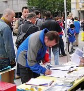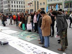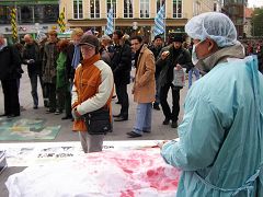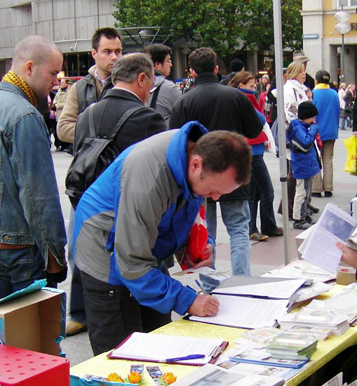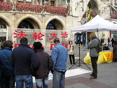 【明慧网二零零六年十一月十日】二零零六年十一月四日,德国慕尼黑法轮功学员在市中心的广场揭露中共活体摘取法轮功学员器官的暴行。当日气温突降,但仍有很多人驻足了解真相。良知尚存的人们被邪恶中共的暴行激怒了,纷纷签字要求德国政府采取行动,制止发生在中国的
