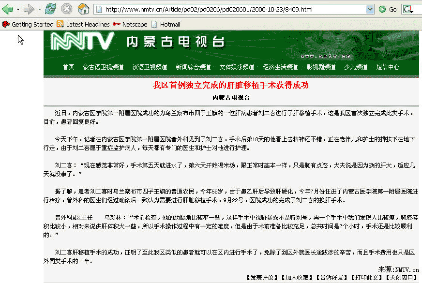内蒙古电视台报道:患者刘二喜在内蒙古医学院第一附属院做肝移植。医务人员:普外科主任:董培德。文中没有说明此肝的来源。第一附属医院咨询电话:0471—6963300—6612(挂号室),董培德,副教授,周一上午、周三下午。
