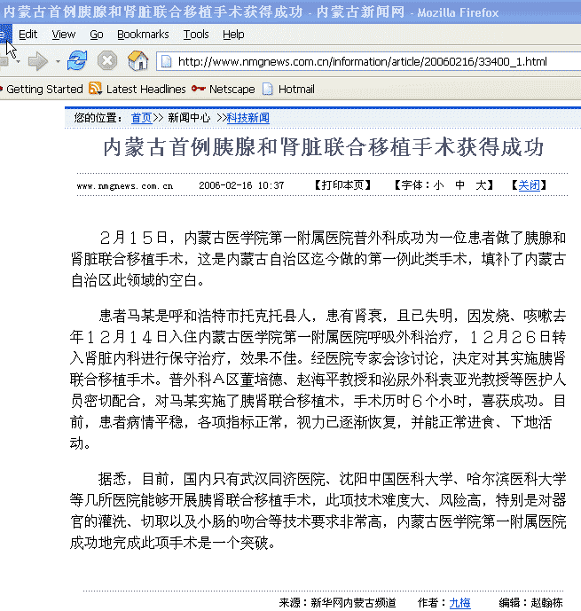 另外,内蒙古医学院第一附属医院完成自治区首例胰肾联合移植手术。同样没有说明器官来源。
