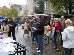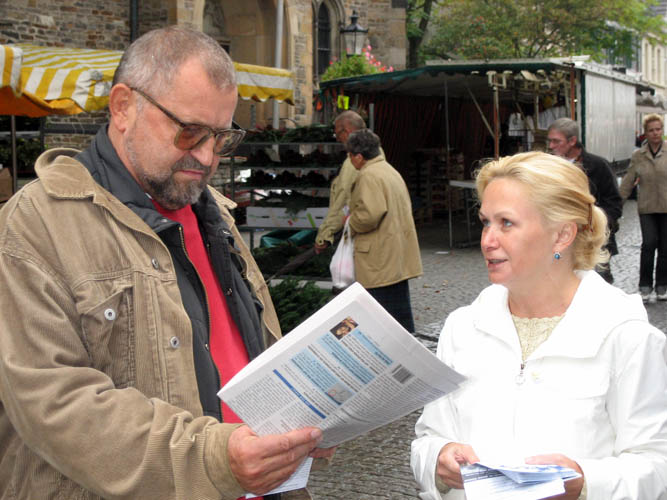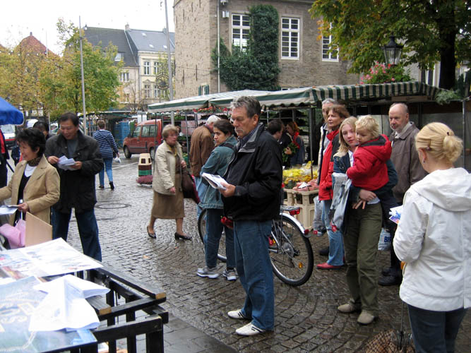同许多其它的小城一样,人们很喜欢利用周六的休息时间前往市中心的农贸市场散步和买菜。虽然当天天气阴冷,还不时的下着小雨,但是,当人们经过设置在市场边上的法轮功信息摊时,还是不由得停步观望。许多人主动上前索要资料,并表示已经了解中共迫害法轮功的事实。