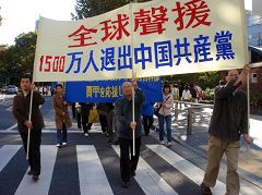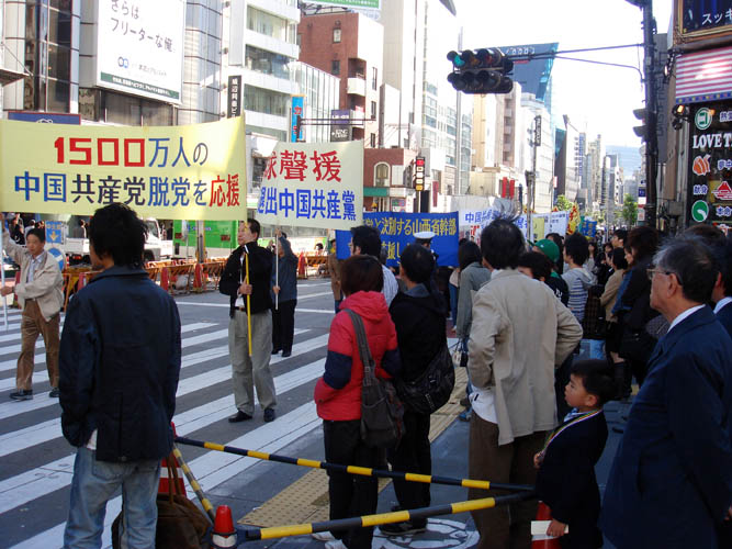 集会民众随后在涩谷区涩谷站附近的繁华地段举行了游行。有一位参加游行的日本人在背后背了一块牌子,上面写着:各位市民,请呼吁在电视报纸上报道中共的盗取器官行为!停止屠杀和压制人权!