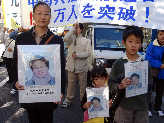 ![]() 法轮功学员吴丽丽手举“还我姐姐吴晓华”在游行队伍中 |
