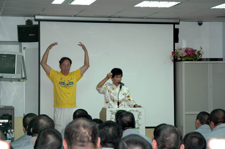 现场同时也放映法轮功的简介与教功带,并且在几位学员的示范下当场教授五套功法。有些受刑人跟着比划的有模有样;有的人站久了或者手举酸了,就坐下来;有的人则担心学大法以后,监狱里地方太小,没有足够的空间可以炼功;也有人问患了某种传染病,炼了法轮功会不会好?还有一位受刑人对法轮功很感兴趣,问是不是真的有“白日飞升”这种事?一位法轮功学员回答说自己没有见过白日飞升,但是体会到炼法轮功确实可以让人感觉一身轻,甚至走路都像有人推着走一样。