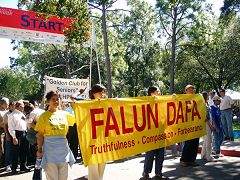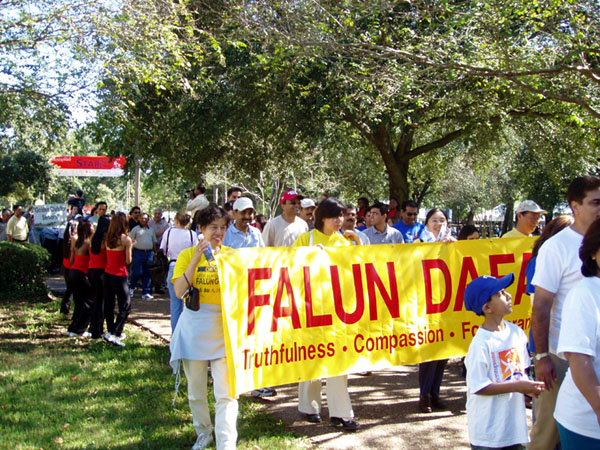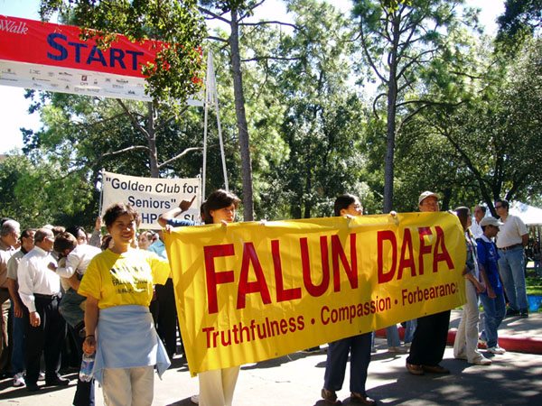 部份休斯顿法轮功学员也义务参加了这一活动。他们身穿“法轮大法好”、“停止对法轮功学员的”等字样的黄色文化衫,手持“法轮大法---真善忍”的横幅,走在步行队伍中,格外引人注目。不少观众挥手致意或鼓掌叫好,有的上前询问法轮功在中国遭受的迫害情况。