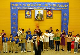 下午法会开始前,由十八岁以下的大法小弟子组成的合奏团为大家演奏了《法轮大法好》、《法鼓法号震十方》和《普世欢腾》,为大家带来气势磅礴、震撼人心的表演,优美的乐声打动在场人士。接着孩子们还背诵了师父的诗《苦其心志》、《做人》和《法轮大法》。