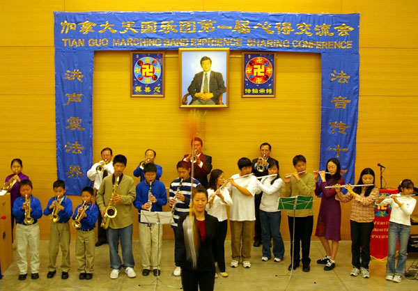 精心布置的法会现场庄严温馨,师父的法像高挂中央,高悬于两侧的是横幅:“洪声震法界 法音传十方”(《洪吟(二)》〈钟楼〉),金光闪闪的大字使整个会场熠熠生辉。多伦多天国乐团自今年四月成立以来已经六个月,已经成为加拿大最大的乐团之一,到目前为止 ,参加了十五次以上的游行和演出,足迹遍及六个城市,许多乐团队员交流了他们在其中修炼的感人故事和体会。