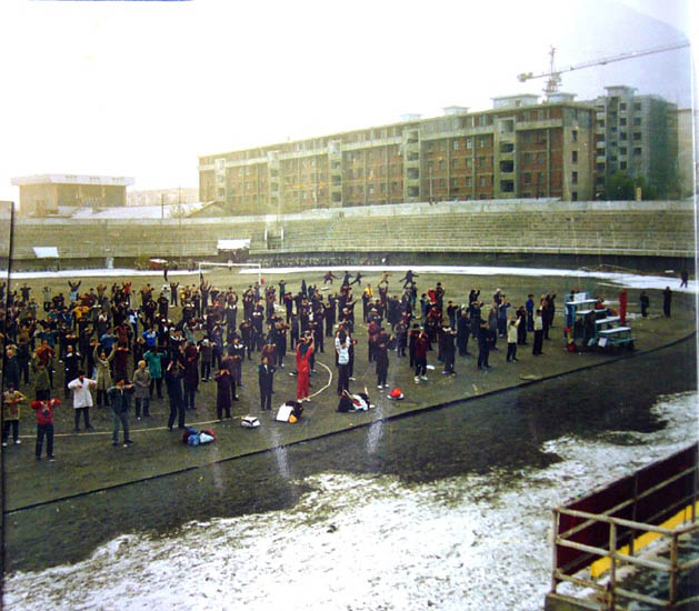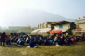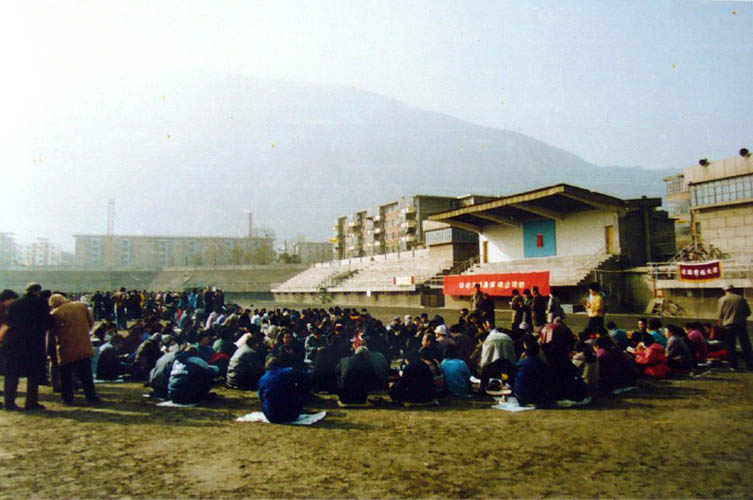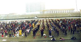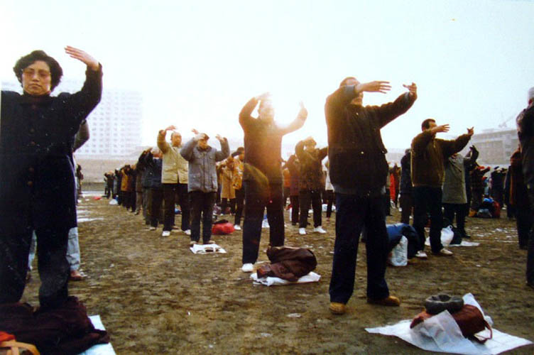 图片:九九年七二零前兰州大法弟子集体炼功学法的场面