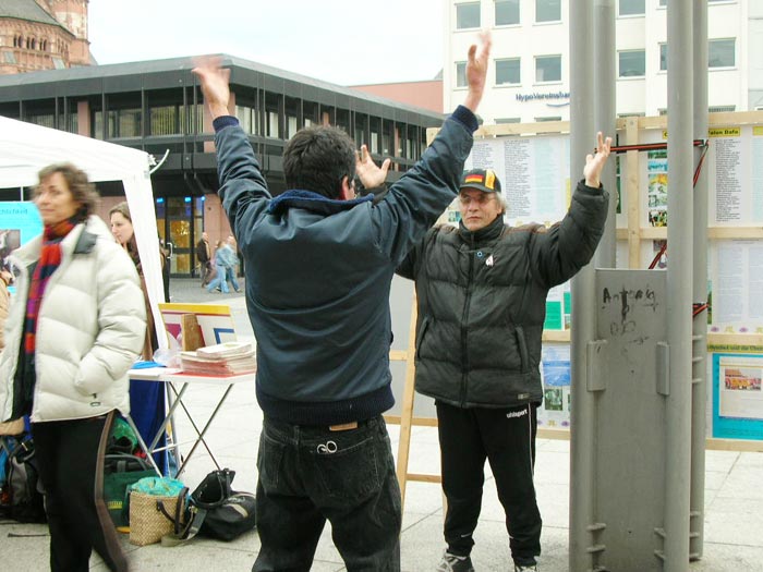 展台一搭好,立刻围过来很多想了解真相的民众。在酷刑展前,模拟手术台前,很多人停住了脚步,静静的观看。当学员用麦克风解说“法轮功是什么”,“99年后遭受了中共的种种迫害”,以及“最近揭露出来的活摘法轮功学员器官的邪恶行径”后,有人惊的目瞪口呆,有人当场指出这是法西斯行为,有人自言自语道“希特勒、希特勒”。了解真相后的人们,大多到展桌前签名,要求制止中共迫害,无条件释放大陆法轮功学员王晓艳(德国留学生张震彤之妻)。也有不少人鉴于中共如此恶劣的人权现状而签名抵制二零零八年奥运会在北京举办。另外,对法轮功有兴趣并表示想学的人也不少,有人当场就跟学员开始学功。