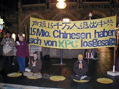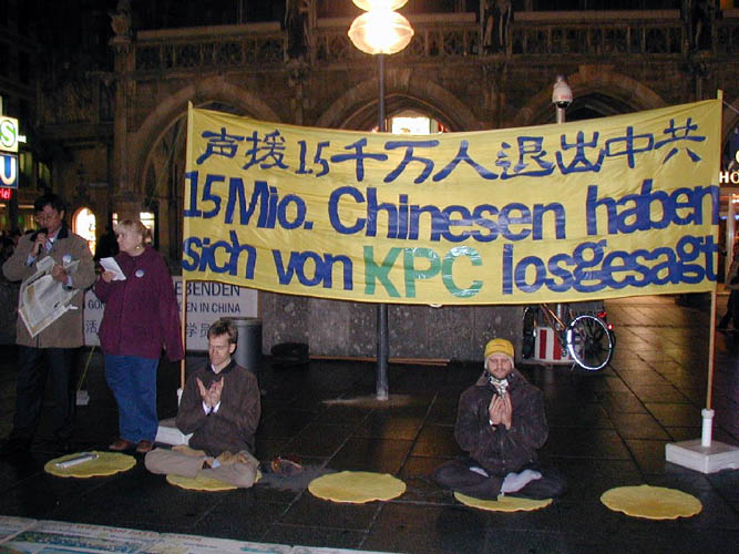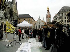 二零零六年十一月十八日,德国慕尼黑市中心最繁华的马琳广场上,来自德国和奥地利的法轮功学员举办了声援一千五百万中国民众退出中共的聚会,揭露中国迫害法轮功的罪行、中共政权对中国民众的暴政、中共对中国传统文化的摧毁,全面暴露中共的流氓本质。