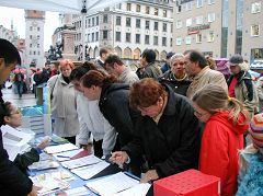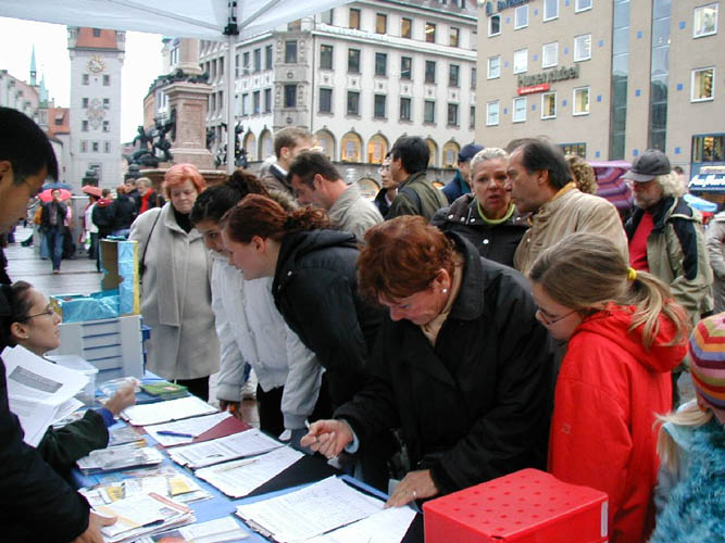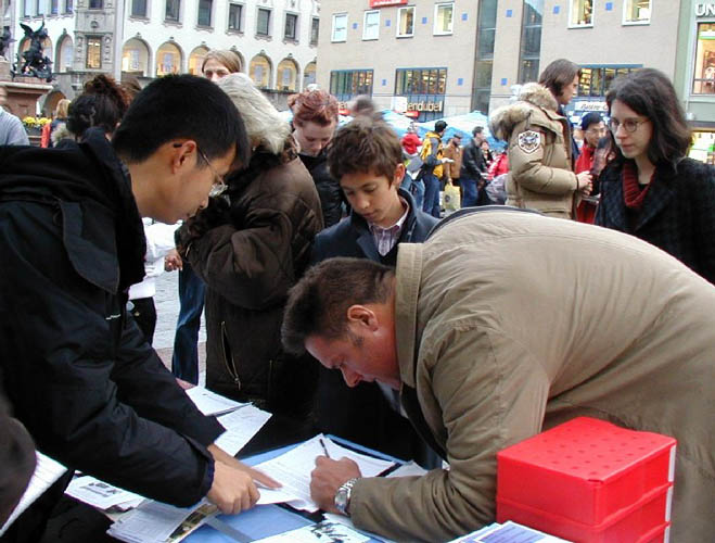 在《·九·评*》发表两周年到来之际,连续三周以来,每周六法轮功学员都在慕尼黑马琳广场举办这样的活动,吸引了无数市民和游人关注。人们纷纷谴责中共对法轮功的迫害,很多人当他们得知法轮功学员征集签名,呼吁德国政府制止中共屠杀法轮功学员时,马上踊跃签名。