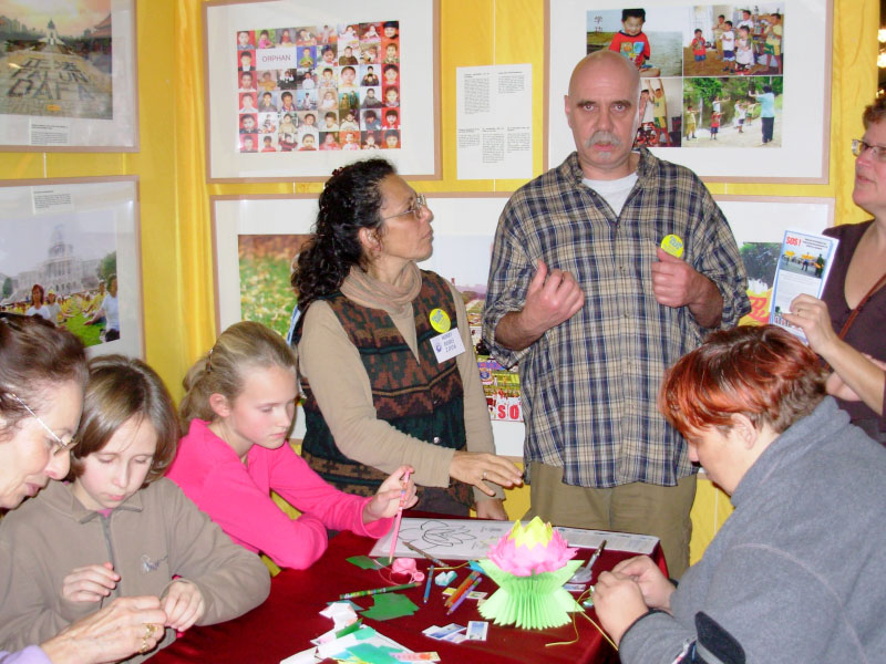 西人学员卡门(kamen)经常讲的忘了吃午饭。她边教授着如何制作莲花,边向人们提出各种问题,如:这个花叫什么名字呀,生长在哪里呀,以及小法度的故事。法度将要出生前,她的爸爸因为修炼真善忍被中国政府关押,被那里的警察迫害死了,她的爸爸妈妈和众多的中国法轮大法学员一样,修炼真善忍只想做个更好的人,可是这在现在的中国却不被现政府允许,许许多多的中国法轮大法学员因此被政府关押迫害以致被迫害致死。这时,她会手指那些失去父母的儿童图片,还告诉他们现在世界各国都在谴责中共政府对法轮大法学员的迫害。以及法轮大法在比利时是能够自由炼习的和受许多人欢迎的。