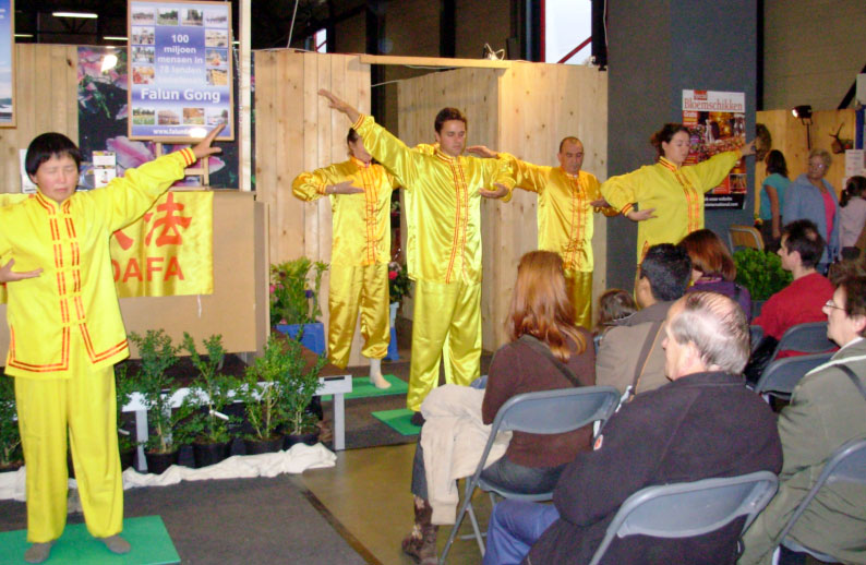 同时,法轮功学员们非常认真的在每天的展厅中央演示台上展示五套功功法;学员撒瓦(Salva)四十多岁,身穿金黄色的炼功服向其他城市赶来帮忙的学员解释着为什么他要拿着一个小板凳,他说他的第五套功法双腿盘坐还有困难,不过其他四套功法他认为他做的没问题,他希望把大法的美好展现给人们,所以他要参加功法演示。