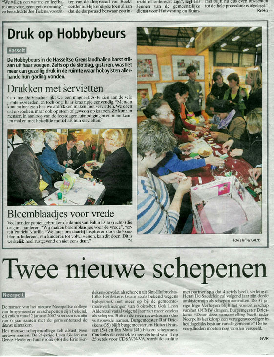 哈索特市是比利时林堡省(limburg)省会,紧靠荷兰南部和德国东部地区,所以每年的展销会都会有许多荷兰和德国的商品参展,以及两国边区的居民过来购物。参展的制作应有尽有。法轮功学员参展的制作是叠莲花,桌面上摆放了各种赠送的法轮大法简介和炼功点等资料以及法轮大法在中国的遭遇资料;墙上布置了多幅大法洪传及孩子们学炼功法图片,其中一幅是被迫害致死的大法弟子的孩子们的图片。