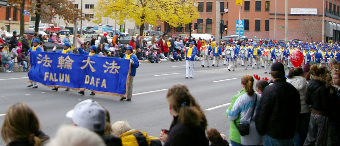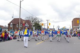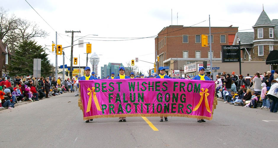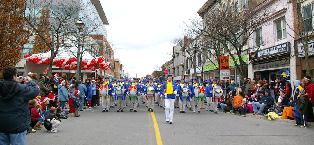 尼尔加拉圣诞游行中,当多伦多天国乐团经过主席台时,主持人介绍说:“法轮功学员把美好的祝愿带给大家,这是来自多伦多的大型军乐团,他们是第一次参加我们的圣诞游行。我们欢迎他们。”观众给与热烈的鼓掌和喝彩。当听到奏起雄壮的“法轮大法好”乐曲,主持人激动的说:“请大家跟着拍子起舞。”欢乐的人们就随着节奏起舞和欢呼。天国乐团在主席台前演奏完两首曲子才缓缓继续向前行进。