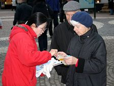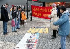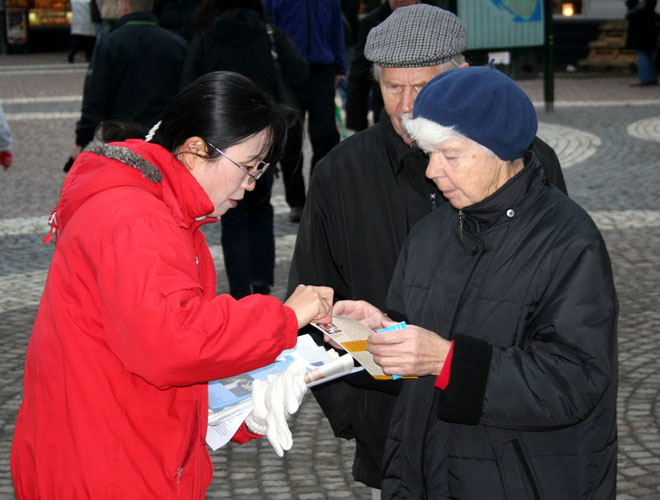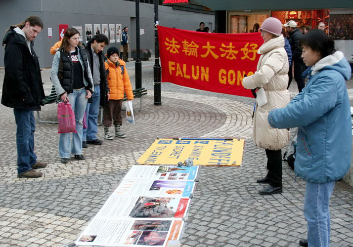 二零零六年十一月十八日法轮功学员们来到斯德哥尔摩北部的社区威灵比(Vallingby)的中心广场。向这里的人们洪法讲真相。活动场地选在地铁的出口处,这里靠近购物中心,来来往往的人很多。法轮功优美的音乐,舒缓的功法表演深深的吸引着过往的人们。人们驻足观看并接过学员们递上的法轮功简介以及真相资料。