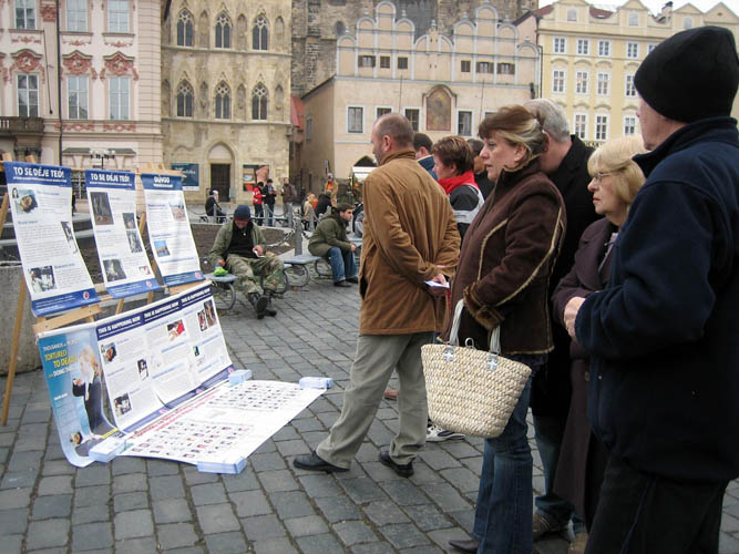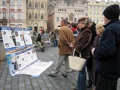 ![]() 布拉格市中心广场上人们驻足观看法轮功真相展板 |