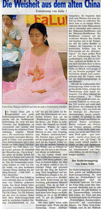 卡姆市当地几家报社对法轮功很支持,为学功班做宣传。其中《卡姆时报》(Chamland Aktuell) 在头版以“来自古老中国的智慧”为题详细介绍了中国传统的佛道两家的修炼以及什么是法轮功。这帮助卡姆当地的广大民众進一步感受到修炼大法的美好和纯正。