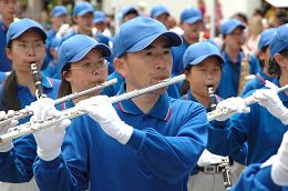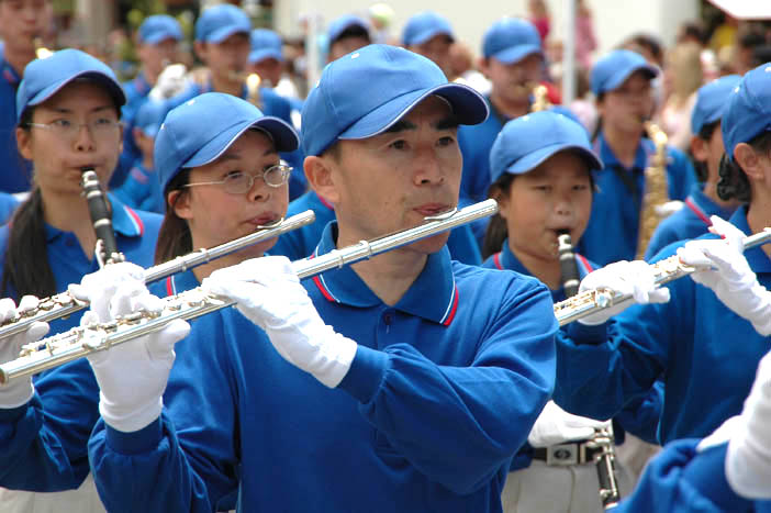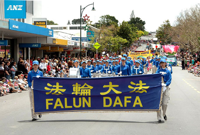 据悉,这是新西兰天国乐团组建以来首次亮相,游行中他们以整齐的多声部演奏了“法轮大法好”乐曲,游行指挥部用高音喇叭介绍了这支由东西方人组建的乐队,并一遍遍高呼:“Falun Dafa is good! Falun Dafa beautiful!(法轮大法好!法轮大法太美了!)” 在整个游行的沿途中乐团获得了无数掌声和欢呼。