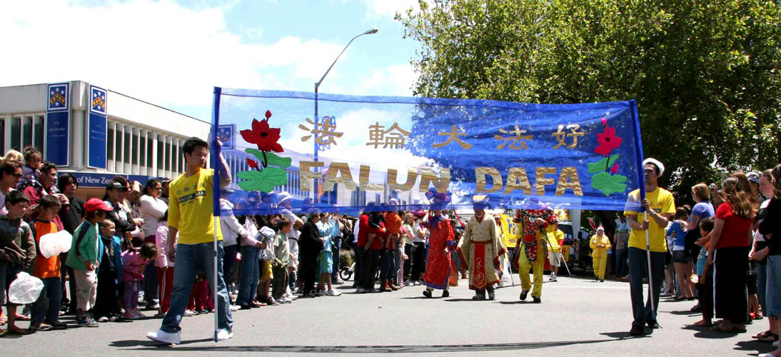 当市长和家人经过法轮大法学员的花车时,饶有兴致的与部份身着唐装的法轮功学员交谈留影,气氛十分轻松。