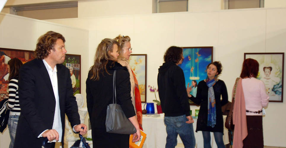 来自各地观光者都被这个与众不同的展位所吸引,看着艺术家的作品,听着传统的中国民族音乐,很多人都长时间的驻足,并来到法轮功学员跟前询问关于这些画的背景情况。