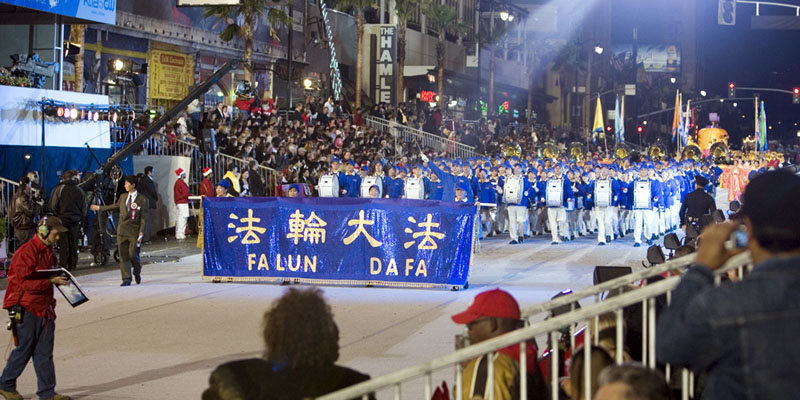 如往年一样,今年游行的起点是著名的中国剧院,总长度二点三英里。路两旁聚集了约五十万观众。洛杉矶KTLA电视台通过Tribune电视网向全美进行了实况直播,并有二十多家电视台在旧金山、波士顿、华府、圣地亚哥、夏威夷等主要大城市的不同频道转播。在当晚全美直播中电视台用了两分半钟报导法轮功队伍的部份。在次日报纸报导好莱坞圣诞游行的专版中,全美第三大报洛杉矶时报把法轮功腰鼓队的图片放在了头条位置。而洛杉矶地区的电视台会在相继而来的几个周末重播该巡游实况。