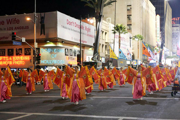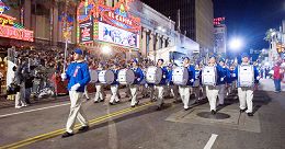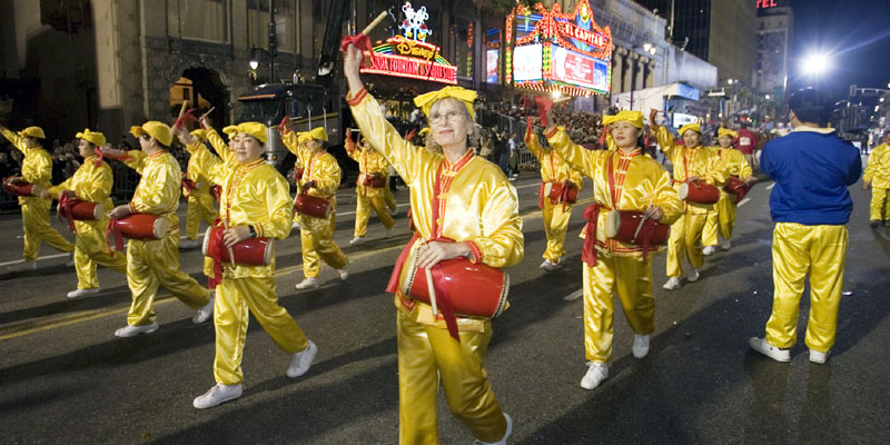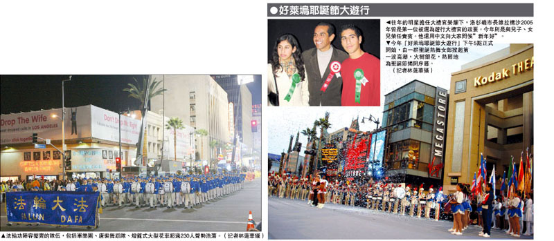 ![]() 刊登在洛杉矶时报好莱坞巡游专刊头条新闻图片。图注中说:来自洛杉矶、圣地亚哥、及旧金山的法轮功学员舞蹈表演者在Grauman's 中国剧院前。 |