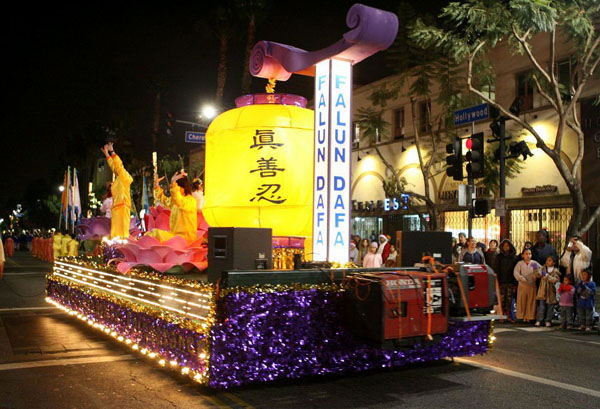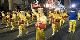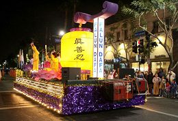 之后是法轮功学员精心制作的巨大灯笼的花车,上面有学员坐在莲花座上演示功法,有的学员不断向沿途观众招手致意,「真善忍」三个大字在大灯笼灯光的辉映下醒目耀眼。