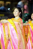 后面紧跟着身着橙色唐装的仙女、随着祥和的音乐而悠然起舞,长而宽的双袖随舞飘扬,传达着法轮功学员的心声:愿把大法的美好传给每一个人。