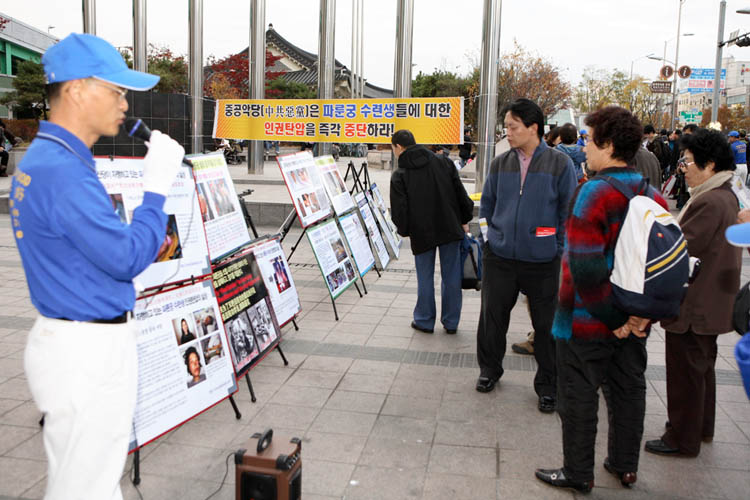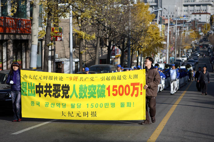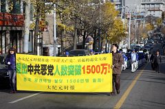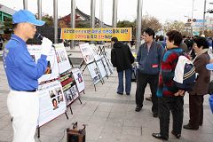 法轮功学员们一讲真相,中国人就三三五五的围过来,边听边为三:退.与否而犹豫不决的场面随处可见,当场就决定退出中共党团组织的有十一人。