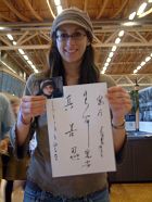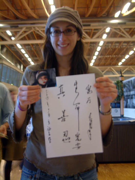 一位高个子西人,搀扶着一位老妇人,来到写书法的学员面前说:这位是我母亲,今天是她的生日,我们想请您给写上“真善忍好”,这将对我母亲是很有意义。在满足了心愿,拿到了写有“真善忍好”及生日祝福的条幅后,老人高兴的连连与学员握手道谢。