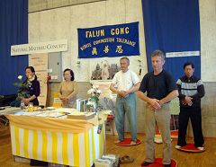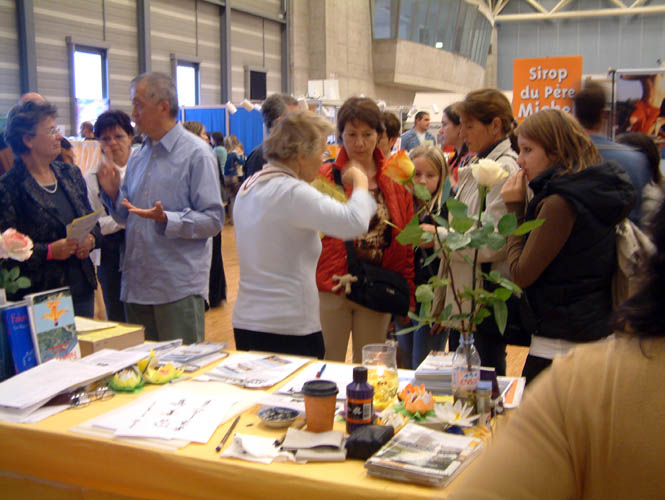展厅左侧法轮功的展台上放着各种语言的法轮大法书籍和揭露中共残酷迫害法轮功学员的真相材料。随着优美祥和的炼功音乐,部份学员在演示着功法。一位擅长书法的学员还免费为有兴趣的观众书写“法轮大法好”,“真善忍好”,“生命需要真善忍”等条幅。