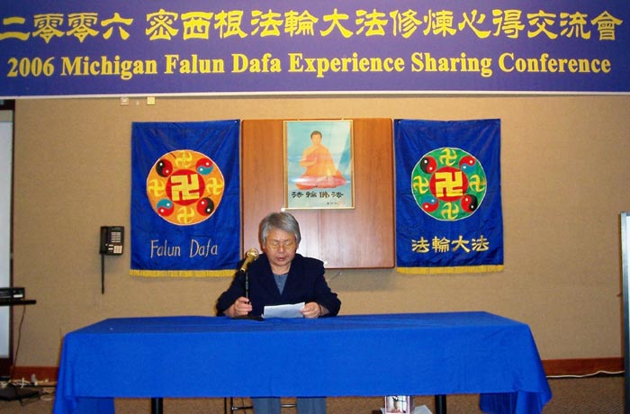 来自加拿大温莎的黎先生,在发言中讲了他八十多岁的父亲被另外空间的邪魔害的大小便失禁,头脑退化。他给父亲戴上真相护身符,还教给父亲每天早晚都要说“法轮大法好”,“真善忍好”,“李老师好”。结果邪魔被吓的无影无踪。老父亲身体从此强壮起来。他的父亲现在每天都和另一位老人一起读《转法轮》、听师父的讲法录音。