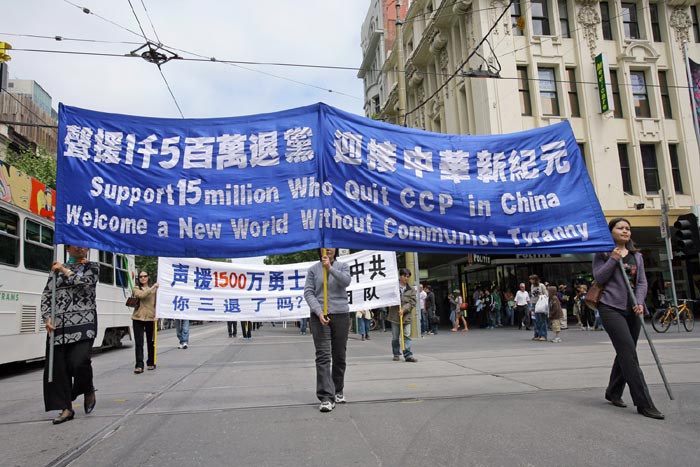 游行后的集会上,维省民主党主席保罗.卡文纳(Paul Kavenaugh),澳洲国民权利组织代表科林.米切尔(Colin Mitchell),维省绿党难民事务发言人彼得.乔布(Peter Job),维省西藏社团主席图布腾(Tupten Dhoudup),墨尔本退!党!服务中心发言人王鹏,大.纪.元;报社代表麦琪,法轮功受迫害真相联合调查团代表Lee,维省法轮大法学会发言人麦克尔.皮特森等在集会上发言。发言人士声援中国民众退!党!壮举,呼吁澳洲民众看清中共邪恶本质,勿作旁观者,支持国际社会向中共施压,促中共打开大门,允许第三方進入中国進行关于法轮功受迫害真相的调查。