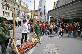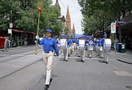 游行队伍中,领头的是来自悉尼的由法轮功学员组成的天国乐队,这是乐队第一次在墨尔本亮相。他们训练有素,步伐整齐,身穿蓝白统一服装,场面壮观,乐声嘹亮。人们纷纷停下脚步,从大楼里、商店里走出来,或合着节拍鼓掌,或竖起大拇指喝彩赞叹,象过节一样笑逐颜开,就连多日笼罩在墨尔本上空的阴云似乎也被这充满阳刚之气的乐声驱散,呈现出阳光普照,清透湛蓝的天空。